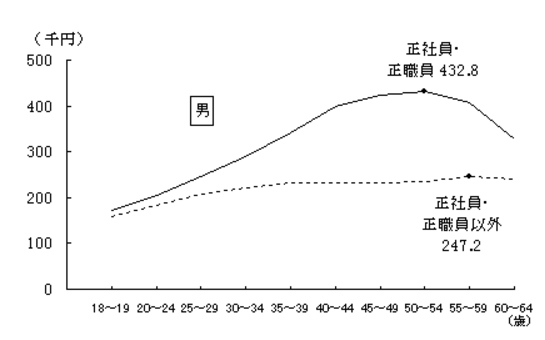 この統計から読み取れるように男性女性ともに、最初の20代前半あたりはそれほど正規社員との差は感じないかもしれませんが、年を取るごとに年収の差はどんどん開いていき、20代後半あたりからは明らかに勝ち組負け組の差がつきます。