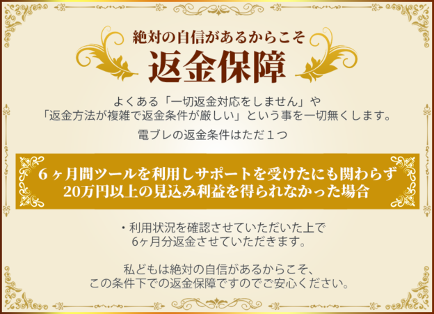 条件は、6カ月ツールを活用して、さまざまなサポートを受けたにも変わらず、20万円以上の利益を得られなかった場合です。