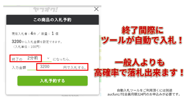 写真の場合は、”終了2分前から3,200円で入札する”という条件設定です。事前に損益分岐点を設定していると、損切の心配なく落札できるためおすすめです!